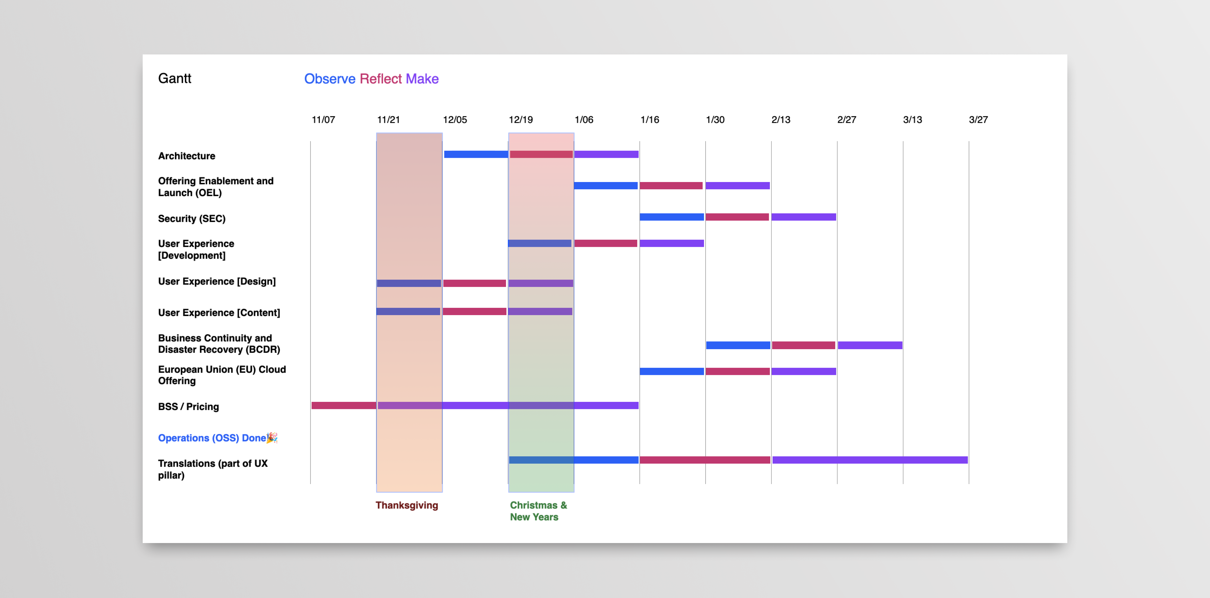 With the current state mapped, we defined the migration in phases by designing functionality in multiple releases. We started by enabling new platform services to onboard in the modern tool, then migrating billable services, then professional services, and eventually retiring the legacy tool entirely. I created a Gantt chart to give leadership visibility into the design team’s roadmap and to help sequence the engineering work.