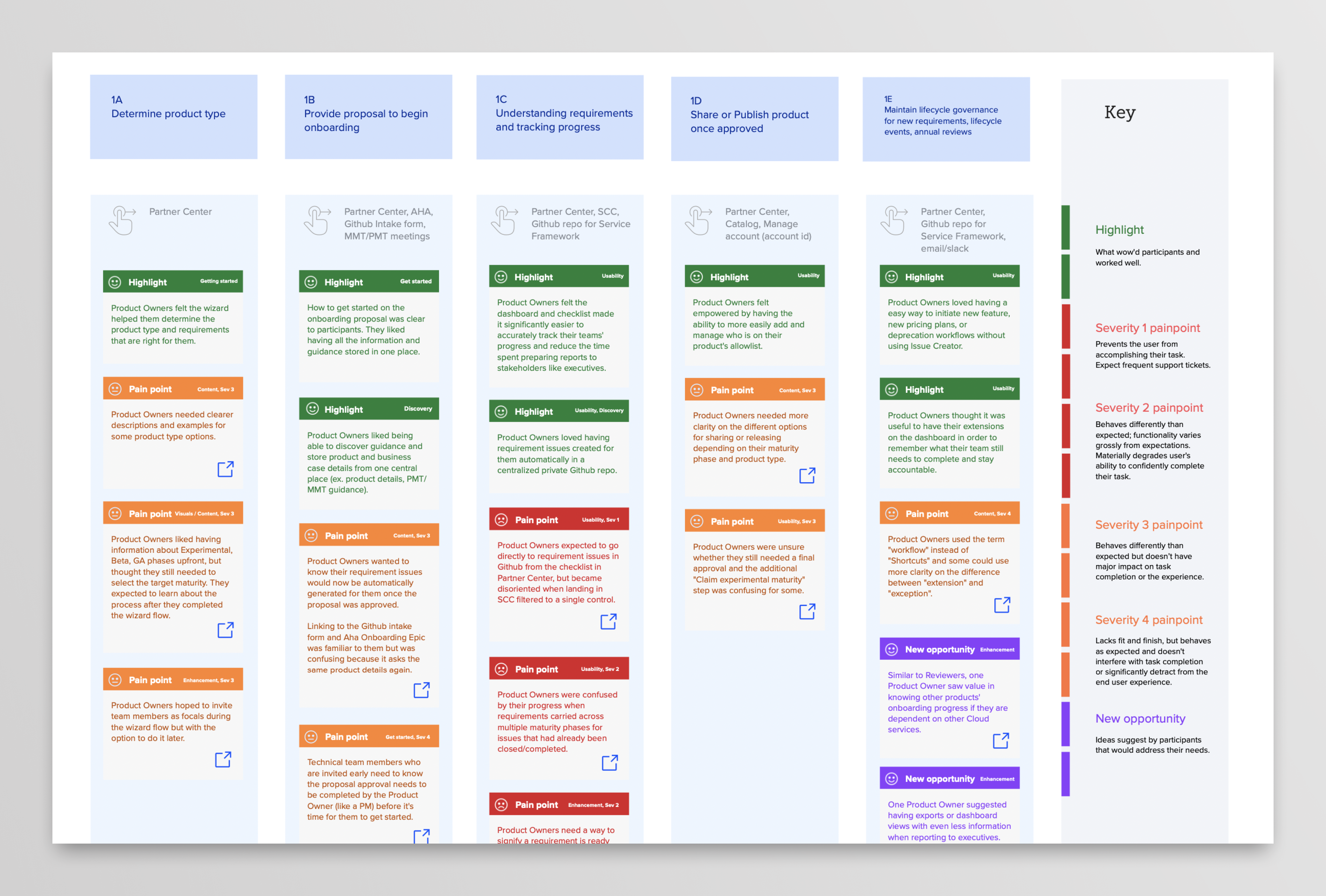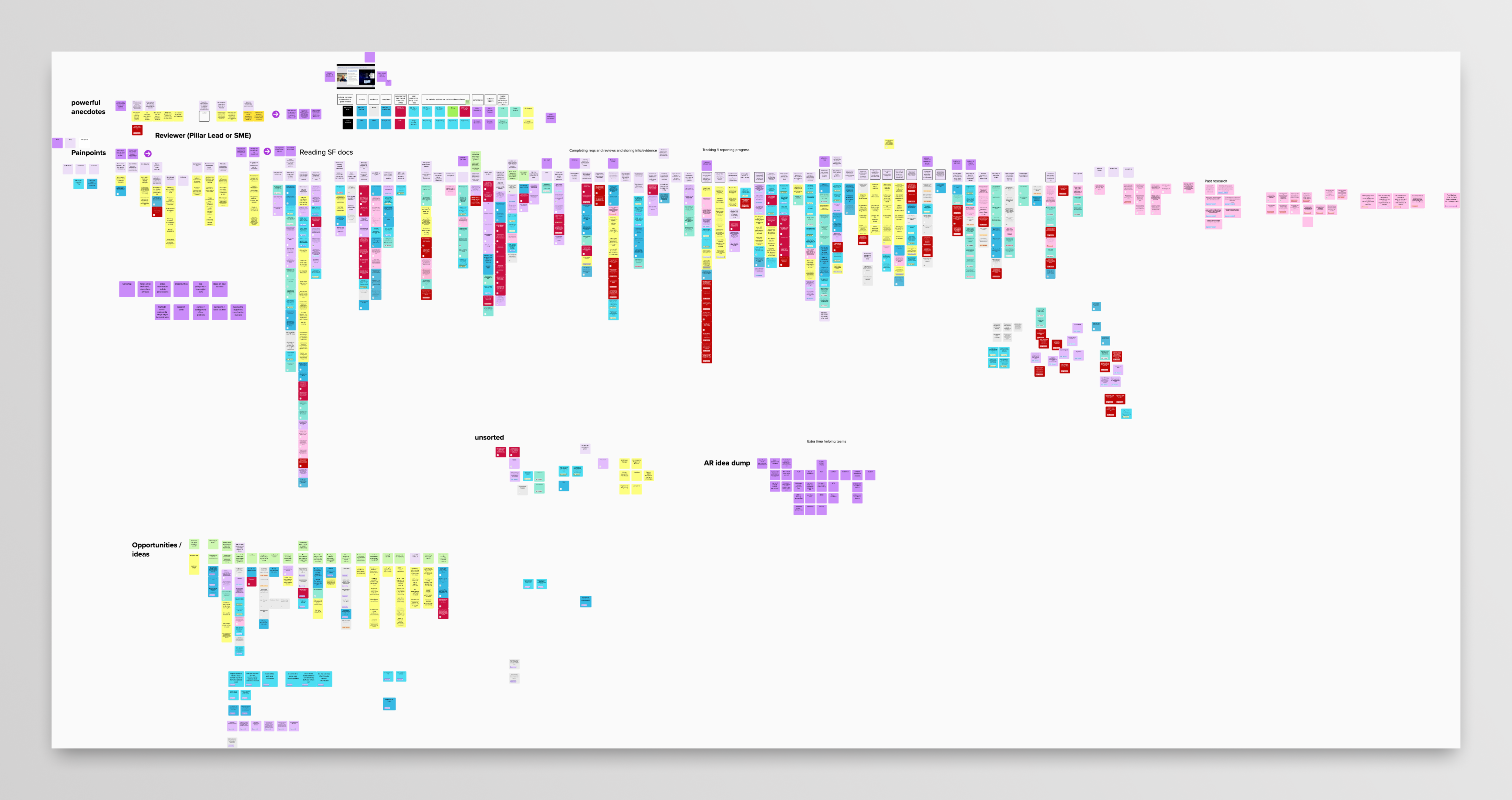 Before we could make changes, we had to understand the ecosystem end-to-end. I partnered with another designer and our researcher to map the current workflows across both systems, pillar by pillar (”Pillars” are distinct subject areas within the service framework and have their own requirements and approvers). What quickly surfaced was the sheer diversity of requirements: IAM, security, billing, catalog management, ecosystem teams, and Service Framework approvers all had different needs for onboarding.